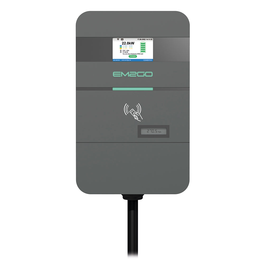 With this 3-phase EM2GO EV charging station with type 2 socket, you can charge your e-vehicles safely and quickly with up to 22 kW power. The EM2GO Wallbox with intelligent control has a variety of communication interfaces for backend control. With the cellular modem, secure mobile data transmission is possible via EDGE, 3G or LTE/4G with appropriate SIM card. Multiple wallboxes can be interconnected with local load management to share available power. The wallbox is equipped with an integrated energy meter (MID) to perform tamper-proof and