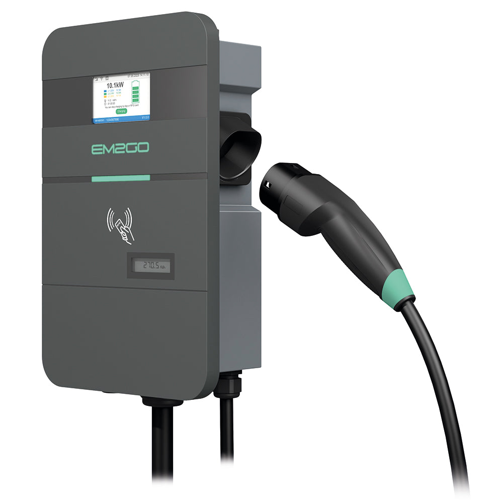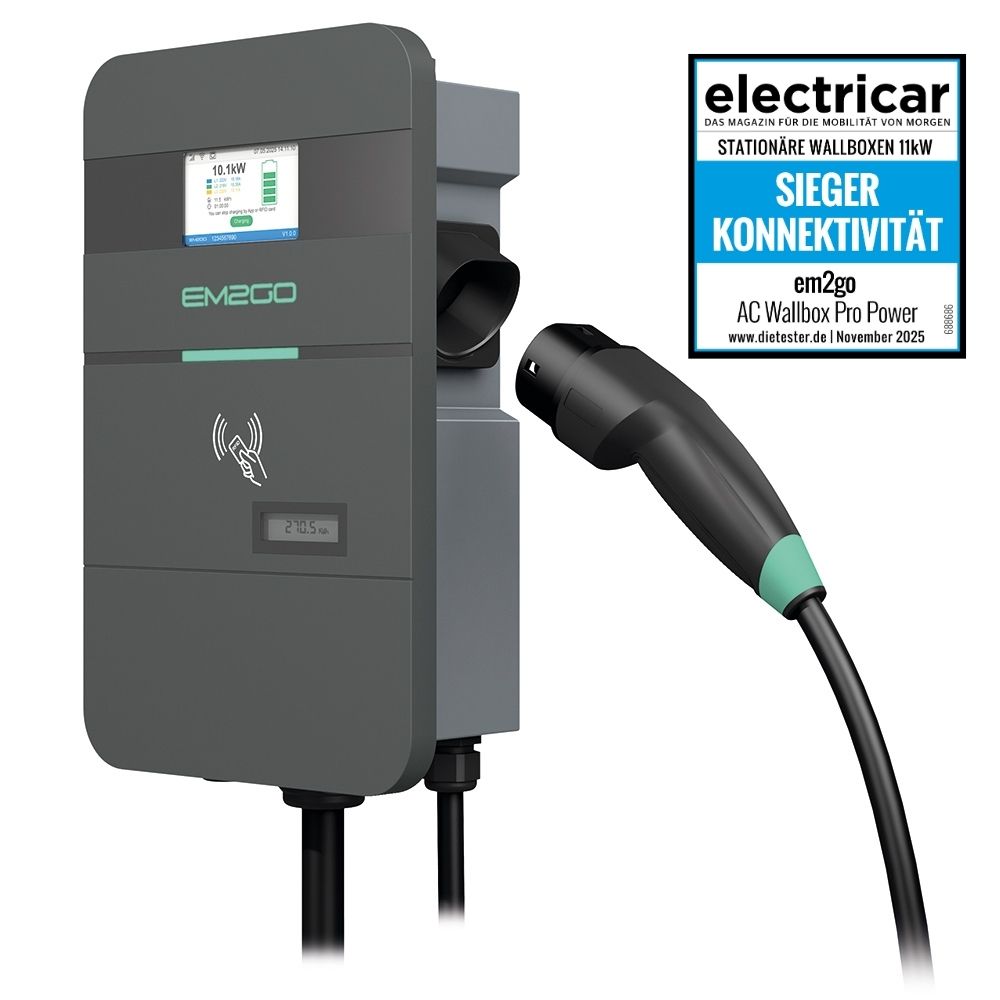 Mit den 3-phasigen EM2GO EV-Ladestationen können Sie Ihr E-Fahrzeug sicher und schnell aufladen. Die EM2GO Wallbox mit Intelligenter Steuerung verfügt über eine Vielzahl an Kommunikationsschnittstellen wie: Ethernet, WLAN und LTE für die Verbindung an ein OCPP 1.6-J fähiges Backend, zur Steuerung via ModBus TCP. Mit dem optionalen Mobilfunkmodem ist die sichere mobile Datenübertragung per EDGE, 3G oder LTE/4G mit entsprechender SIM-Karte möglich. Die Wallbox ist zudem optional mit einem integrierten, geeichten Energiezähler (MID) verfügbar, um manipulationssicher und kilowattstundengenau Abrechnungen durchzuführen. Mehrere Wallboxen können über das lokale Lastmanagement zusammengeschaltet werden, um den verfügbaren Strom aufzuteilen. Des Weiteren hat die Wallbox einen integrierten RFID-Leser. Der eingebaute allstromsensitive Differenzstromsensor (RCMU) schützt gegen Fehlerströme während eines Ladevorgangs. Das 4.3 Zoll große Farbdisplay informiert Sie während des Ladevorgangs über den aktuellen Ladezustand, Ladespannung, Strom und Leistung. Das LED-Band zeiget den Zustand der Wallbox an und informiert über den ordnungsgemäßen Ladevorgang. Die EM2GO EV-Ladestation ist mit intelligenter Elektronik ausgestattet. So ist Ihr Fahrzeug gegen Über-/Unterspannung, Fehlerströme, Kurzschlüsse und hohe Temperaturen bestens geschützt.